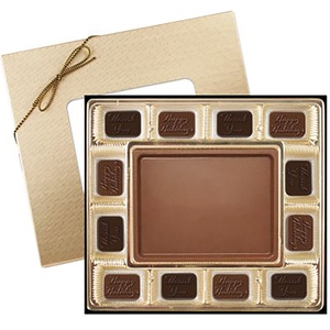 Small custom chocolate delights gift box. 12 themed chocolate pieces surrounding a creamy milk or dark chocolate centerpiece. Select up to 2 themed chocolate pieces in milk and dark chocolate.