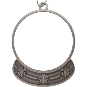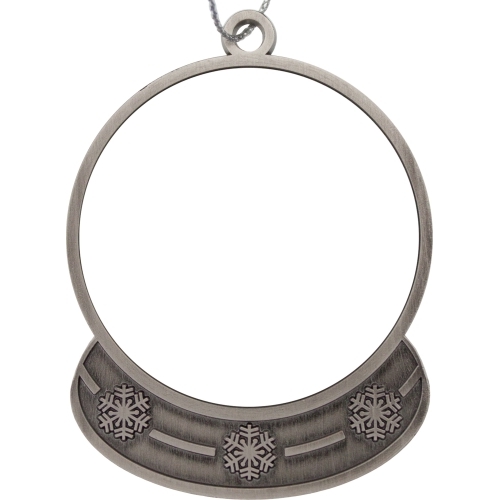 Snow Globe Christmas holiday ornament in rich antique silver finish. Includes a large full color imprint w/poly dome. Includes silver metallic hanging cord for easy Christmas tree decoration. Ornament sizes approximately 2-1/2" high. Create your own custom holiday design or choose from 4 stock background designs. Production time: 6 working days standard, 4 day rush service available. Includes unique decorative gift envelope for easy holiday giving. Velour gift pouch also available.